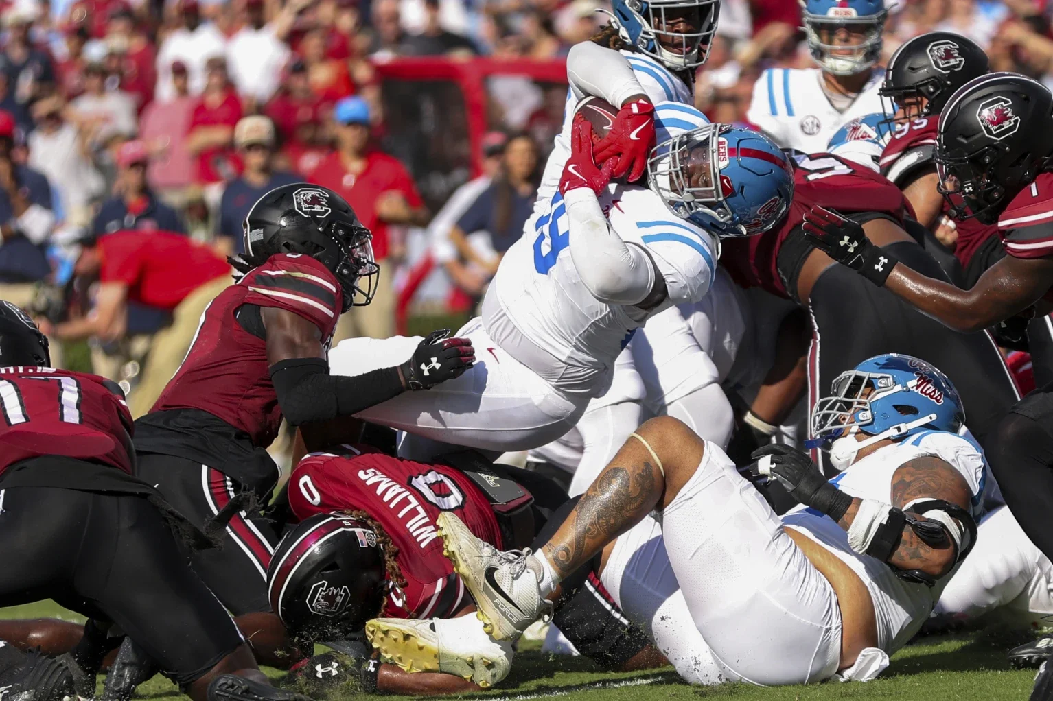 COLUMBIA, S.C. (AP) — JJ Pegues, a 325-pound nose tackle, ran for two short touchdowns as No. 12 Mississippi bounced back from its first loss of the season to beat South Carolina 27-3 on Saturday and give coach Lane Kiffin his 100th career victory.