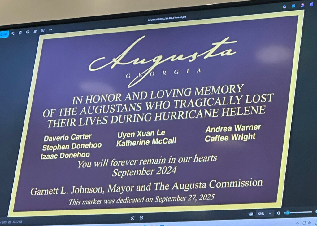 The commission approved at Johnson’s request installing a marker honoring seven Augustans who lost their lives in Hurricane Helene. The victims listed all died when trees fell on their homes. They are Stephen Donehoo and his grandson Izaac Donehoo; Daverio Carter; Uyen Zuan Le; Katherine McCall; Andrea Warner and Caffee Wright.
