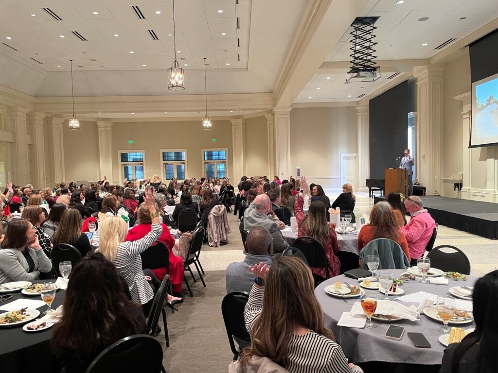 Thrilling stories and fun and games abounded in the fellowship hall of First Baptist Church of Augusta, Tuesday morning. The Augusta Metro Chamber of Commerce hosted its monthly Women in Business luncheon, the keynote speaker for which was Shane Thompson, who oversees marketing at Windsor Jewelers.
