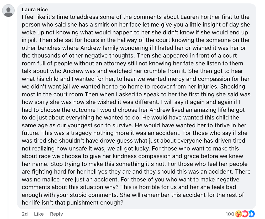 Rice emphasized that neither she nor her family wanted Fortner to be incarcerated, instead asking for mercy and compassion. “Andrew lived an amazing life… He would have wanted this child — the same age as our youngest son — to survive. He would have wanted her to thrive in her future.”