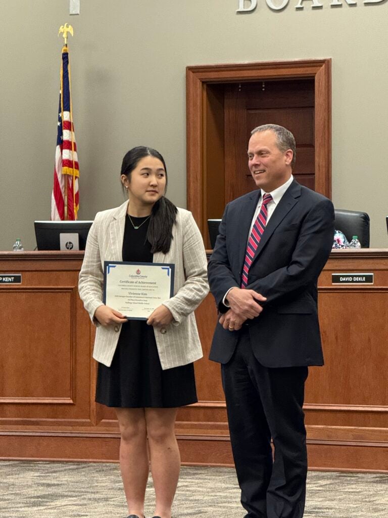 The district also recognized Vivienne Kim, a former Stallings Island student now a Lakeside High School student, for placing third in the 2025 Georgia State Finals of the National Civics Bee. Associate Superintendent Dr. Kristen Caroll recapped her path through local, regional and state competitions.Kim received an ovation from the audience as she received her certificate at the front of the meeting room.