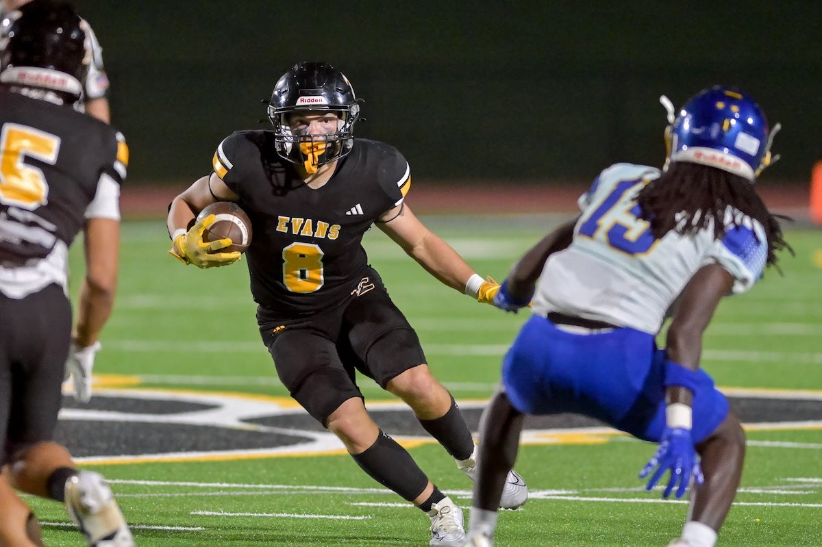 The tone was set early when Brunswick 4-star tight end and Florida Gators commit Heze Kent (6’7, 300 lbs.) made his presence felt on the Pirates’ first offensive snap, hauling in a catch for a first down. The Pirates then marched downfield for a quick touchdown, making it 7-0. On Evans’ first offensive series, things unraveled quickly as Brunswick defensive back Antwan Kirk intercepted quarterback Tripp Fergeison and returned it for a score, doubling the lead to 14-0. Moments later, a disastrous snap on a fourth-and-31 punt attempt resulted in a safety, pushing the margin to 16-0 before the Knights could gain their footing.