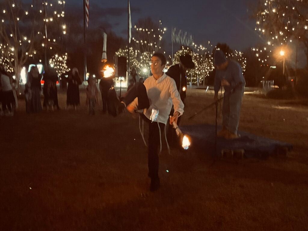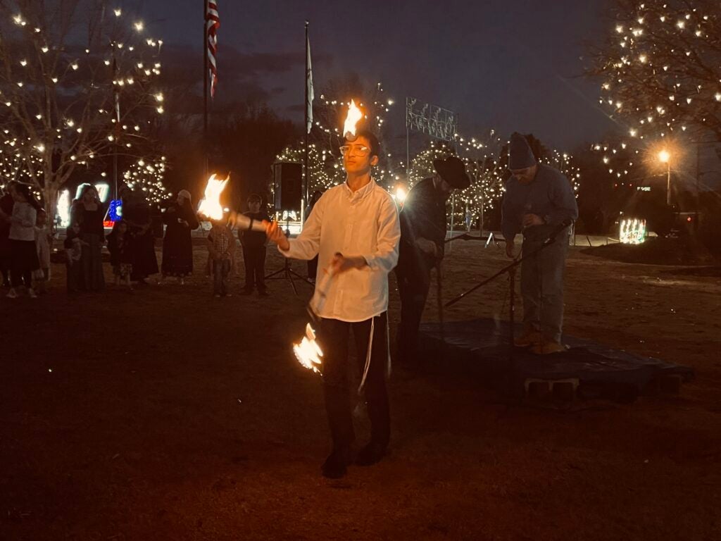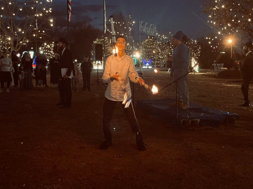 Rabbi Zalman Fischer of Chabad of Augusta presided over the ceremony, in which the eight-branched candelabra, or menorah, is lit to commence the eight-day Festival of Lights. Children signing Hanukkah songs, the distribution of fried latkes and donuts, and even fire juggling were among the highlights of the evening, which culminated in the dropping of the gelt—chocolate coins traditionally given to children for Hanukkah—in parachutes, courtesy of the Columbia County Fire Dept.