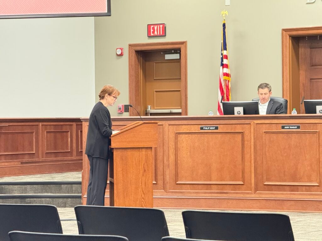Karin Parham spoke during public participation to express concerns about how book challenges were handled in May and the district’s updated media review procedure, known as IFOP-9.