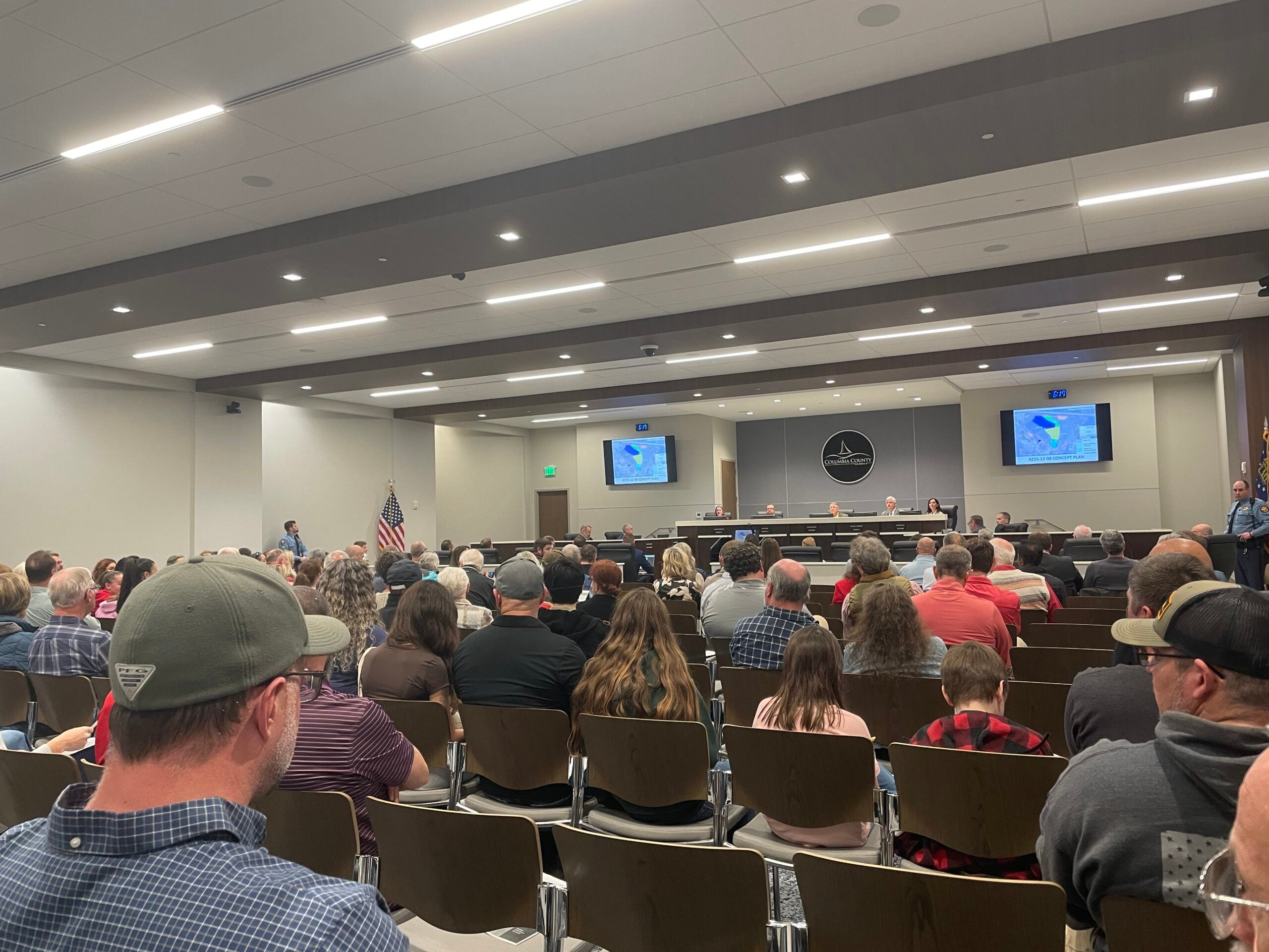 Crowd awaits decision of the Columbia County Board of Commissioners on a proposed quarry in Grovetown. Photo by Skyler Andrews.