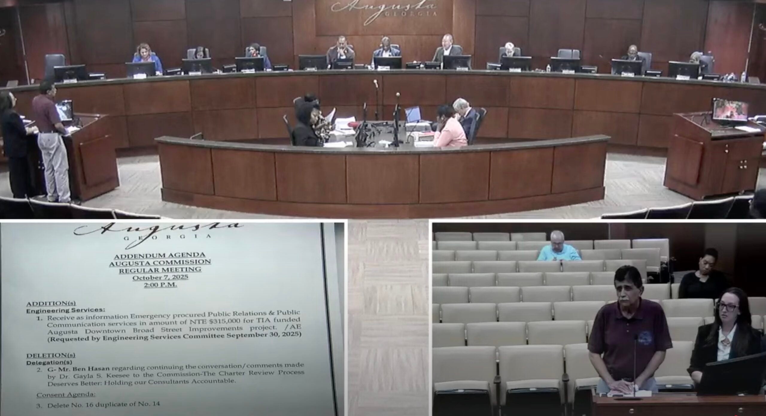 Augusta Engineering and Environmental Services Director Hameed Malik and Megan Paquin, founder and CEO of Paquin Public Relations, speak to the Augusta Commission Tuesday.