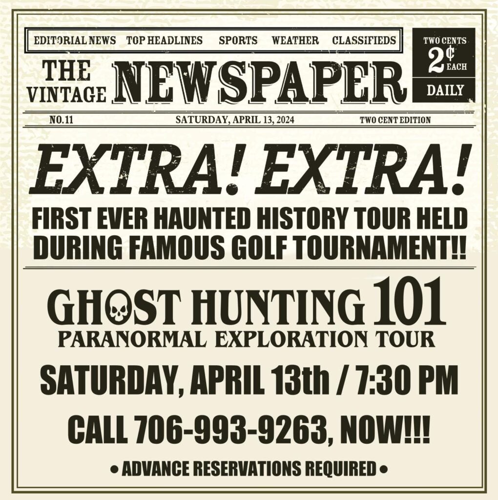 The Ghost Hunting 101 Paranormal Exploration Tour will be at the Marion Hatcher Center on 519 Greene St., Saturday evening at 7:30 p.m. Reservations are required. For more information, visit Augusta Adventures’ Facebook page at https://www.facebook.com/AugustaAdventureTours.
