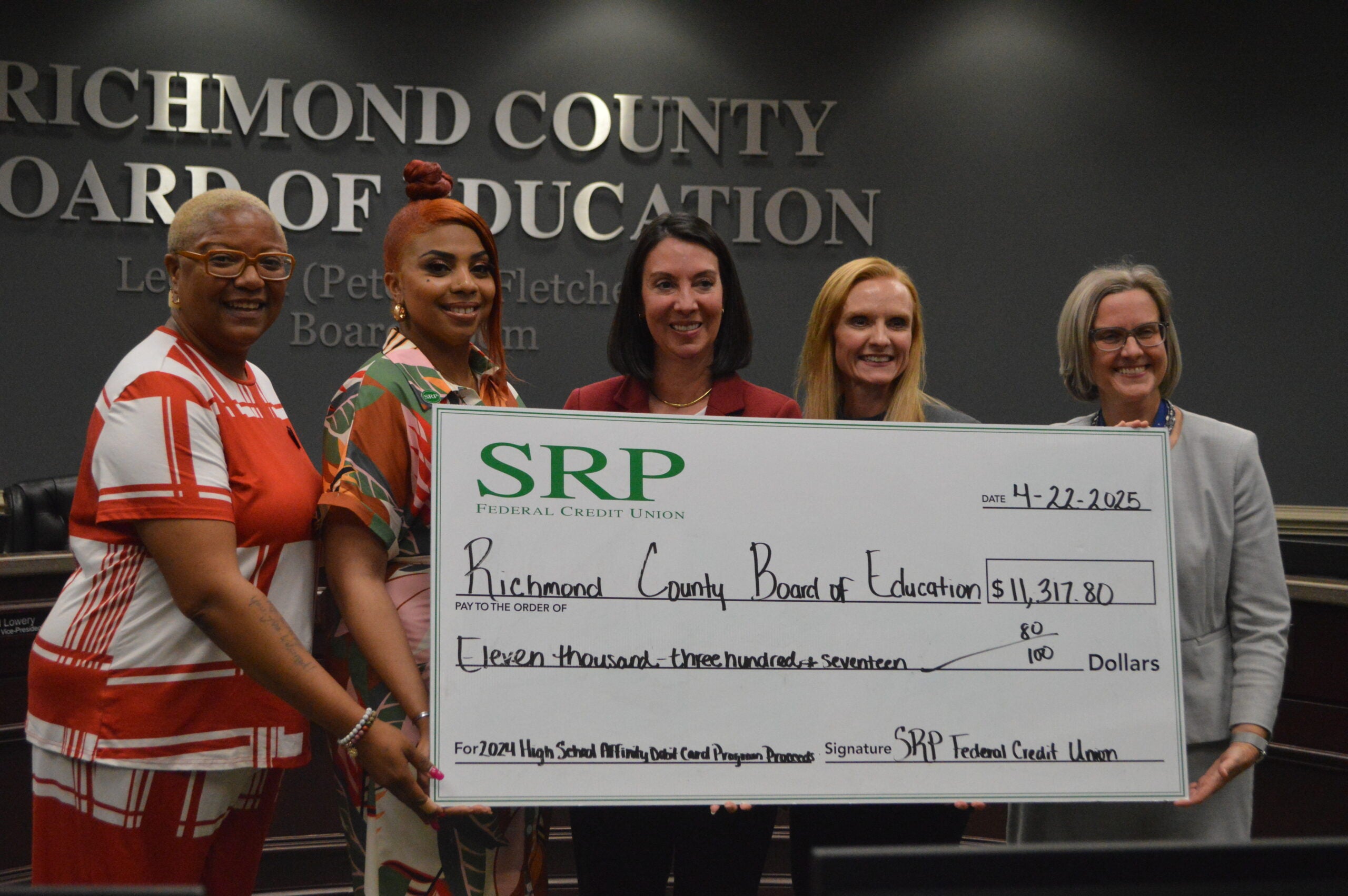 SRP Federal Credit Union presented the Richmond County School System (RCSS) with a check for over $11,000, representing money raised for the district through the bank’s High School Affinity Debit Card Program.