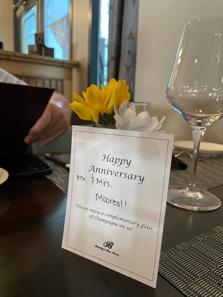 As my husband, Sean, and I walked into Brinkley’s Chop House, the hostess smilingly asked if it was a special occasion. It was — our anniversary — and as she ushered us to our table, she produced a card with a Happy Anniversary message, our names, handwritten and an offer for complimentary champagne.