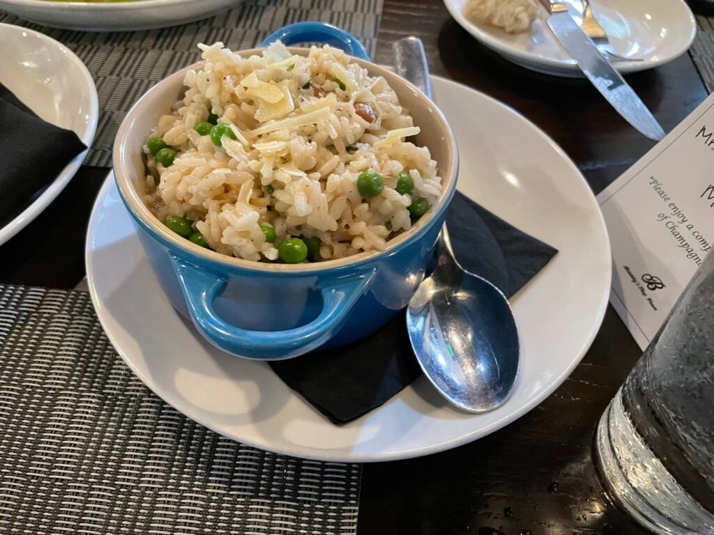 My husband and I both decided to order one of the regular steaks, the 14 oz. prime ribeye, which is served with a parmesan potato croquette and poached asparagus. We wanted to try a side of risotto, so we added that. And to create our own custom land and sea meal, we ordered the salmon and crab crudo to start.