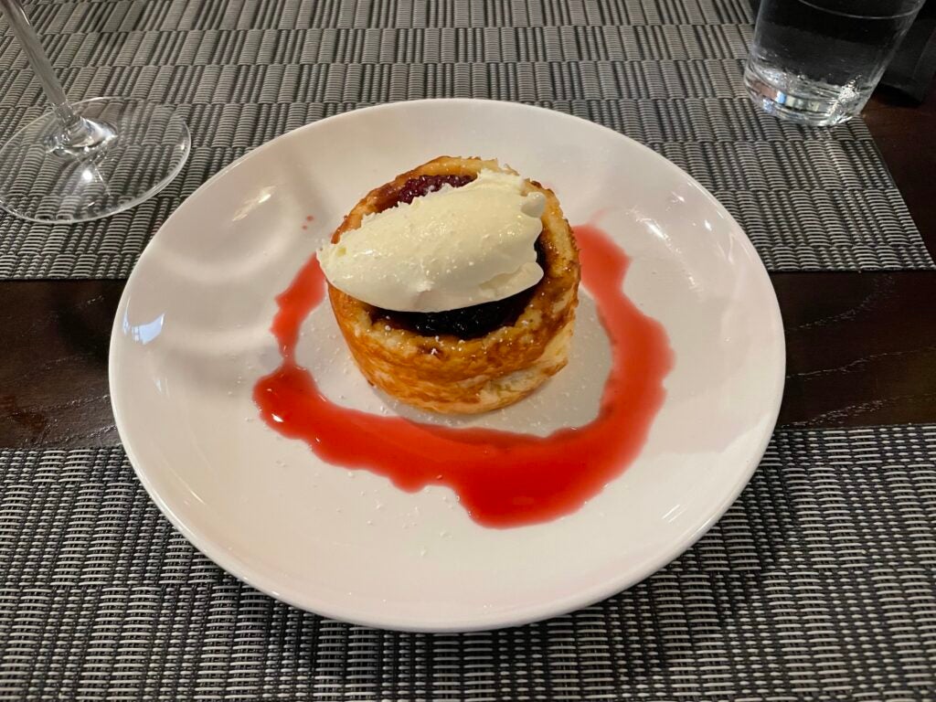 It’s different from our American-style cheesecakes as there’s no graham-cracker or other cookie-type crust. It’s just pure cream cheese whipped with heavy cream, sugar and eggs, baked in a pan to create its own crust and with a deep caramelized top. The flavor of Brinkley’s version is further accented with a sweet topping of Frangelico blackberries and lightly sweet mascarpone.