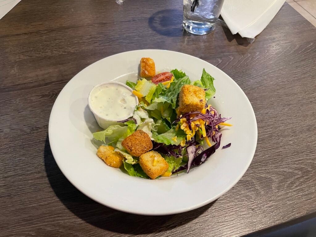 My dish came with a salad, and my daughter immediately sampled a crunchy garlic crouton. I dived into the bowl of romaine, dressed simply with a bit of shredded purple cabbage, grated cheddar cheese, and a couple of halved grape tomatoes. It was definitely crisp and fresh, served with a cup of super tangy ranch dressing.