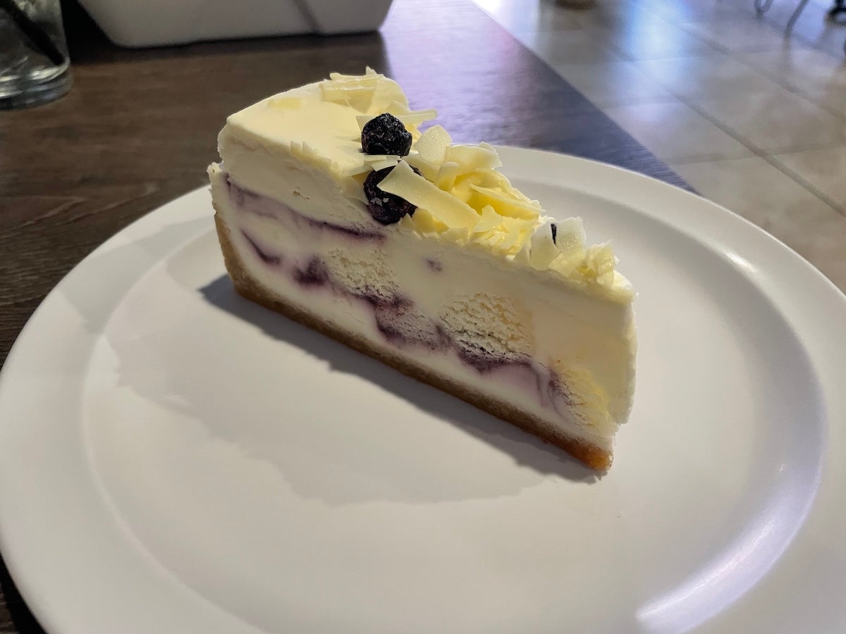 Both of us had more than enough to bring home. But we’d already seen the desserts listed on a chalkboard at the front of the restaurant and had decided we had to have a cheesecake. The day’s options were crème brulee, regular and blueberry, and we chose the last. Granted, we were so full, we couldn’t finish even the slice we shared, but it was firm and creamy, not as tangy as some cheesecakes. The blueberry swirl added extra sweetness, and I liked the plump whole dried blueberries that topped it.