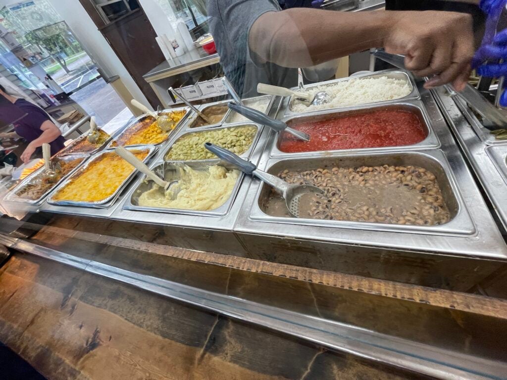 To order, you step up to the counter. A huge metal menu features the buffet selections, but I prefer to look at the array of foods on the warming table. Of course, that makes it harder to choose. I hesitated over the crispy fried chicken, glazed ribs, creamy orange mac and cheese, buttery lima beans, mashed potatoes and gravy, and more.