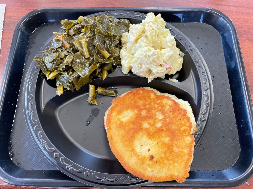 But in the end, I decided to order what I couldn’t see: the fried shrimp, which are freshly prepared per order, along with a scoop of cold potato salad and collard greens (those were a must — their delicious tangy odor permeated the restaurant that day). Instead of a roll, I also chose the buttery hoecake, which is almost as big as my head!