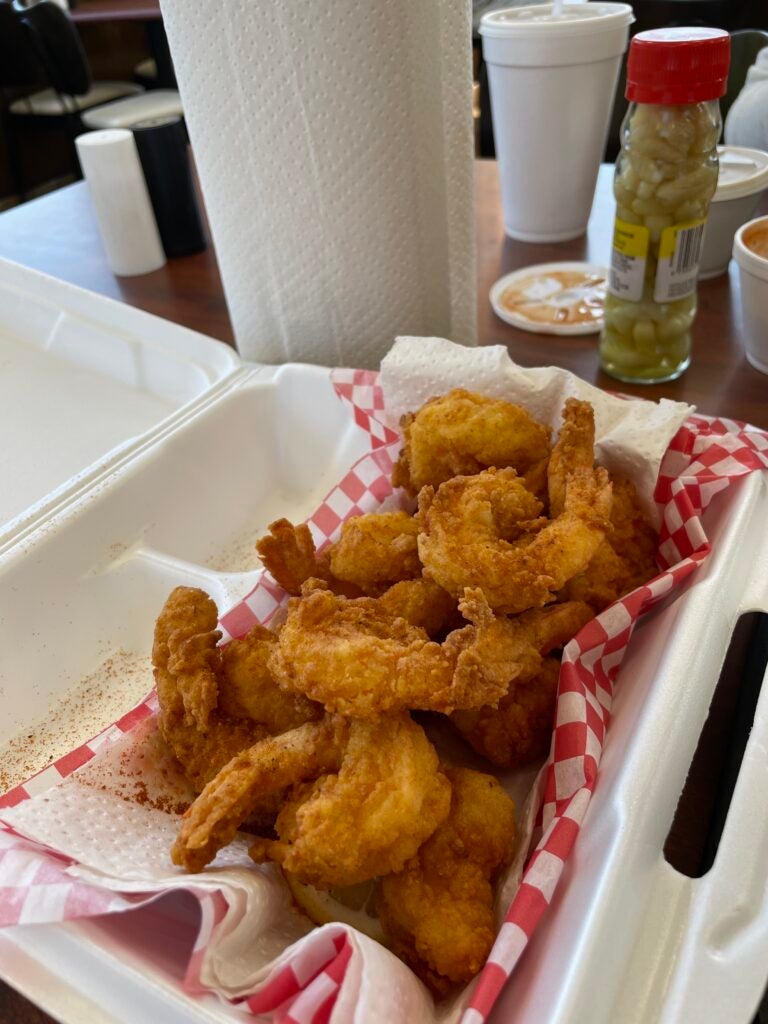 When my shrimp arrived, I couldn’t believe I was getting this entire meal for $12.99. The order comes with eight shrimp, but they’re huge. Hot and crisp, with a delicate crust dusted with lemony seafood seasoning, they were terrific, especially when dunked in my favored condiment of cocktail sauce.