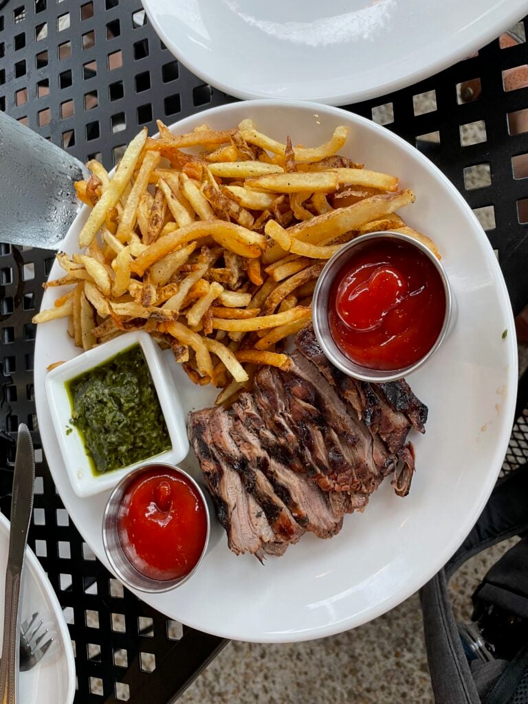 My daughter and I shared my steak. She pronounced it “chewy.” While it wasn’t the most tender, it had just a bit of a bite to it. I lavished it with the chimichurri, which was like a bright and tangy pesto (but without the cheese that Italians would add). It was vibrant and strong, with plenty of acid, I’m guessing either from lemon or a vinegar. It really transformed the steak dinner into something a little more exotic. And we both approved of the fries, which were the shoestring variety with lovely crisp edges.