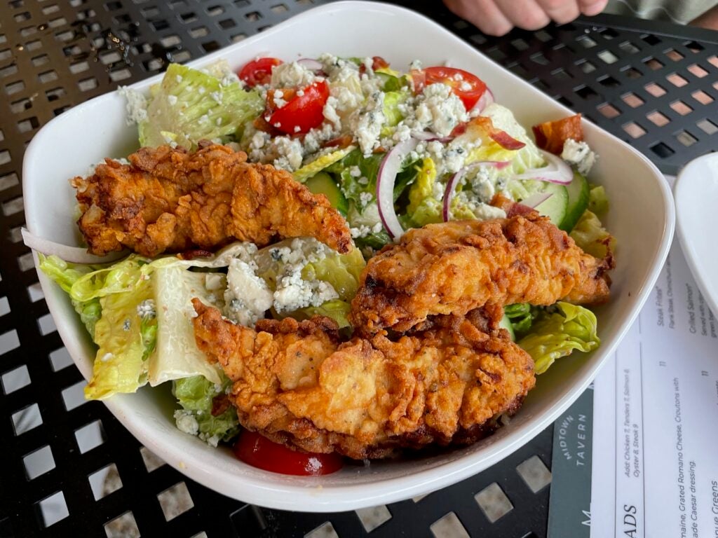 Sean dived into his salad, a hearty mix of greens, topped with the tenders and sprinkles of blue cheese. Tender was an appropriate name — the chicken was super tender, with a delicate seasoned crust. The salad itself was so flavorful thanks to the blue cheese, strips of bacon, red onion and the house dressing, which was a sweet and tangy truffle honey mustard.