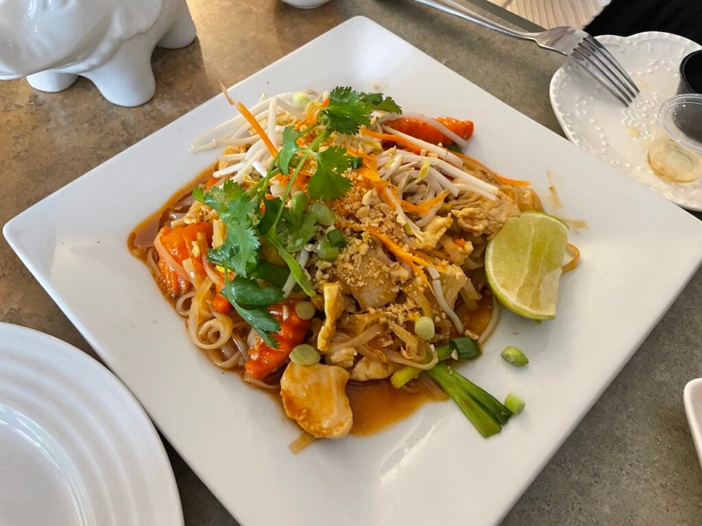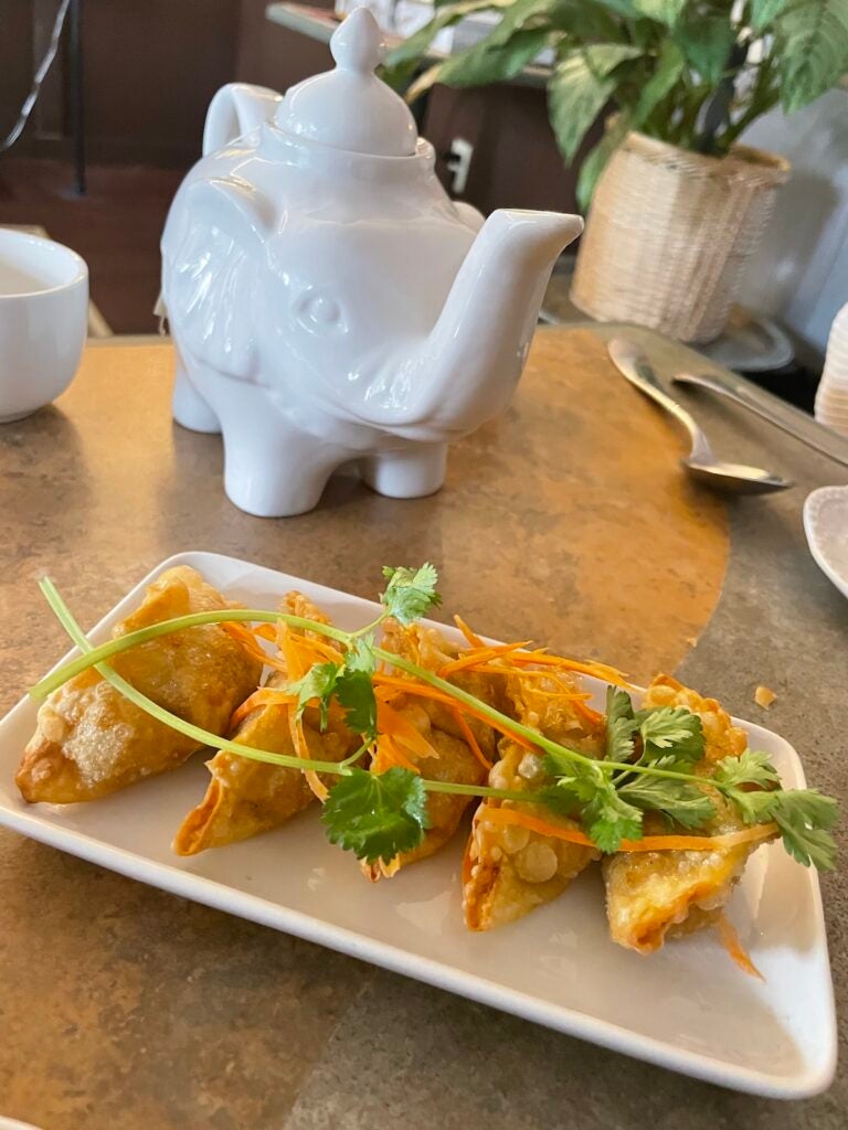 For my sneak-peek lunch, I’d selected one of 25 different lunch entrees, each served with a spring roll, to share with my friend Christy. We enjoyed the pad thai, scattered with peanuts and bright with fish sauce; the crisp and crunchy veggie spring roll; and an appethaizer (points to Tifudi for this clever pun!) of plump potstickers filled with savory chicken and pork — all while sipping on hot jasmine tea poured from a white porcelain elephant teapot.