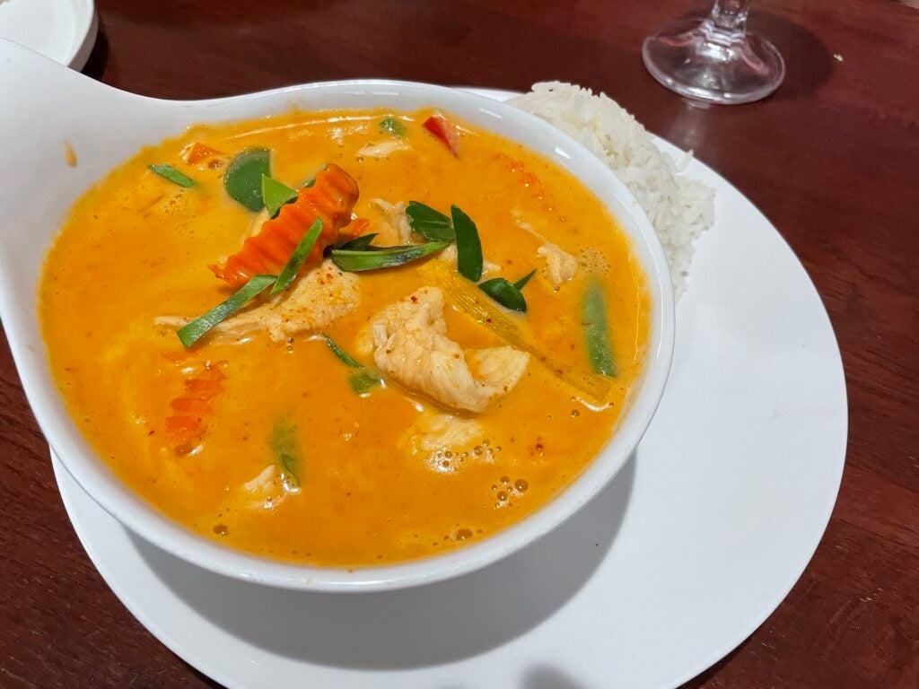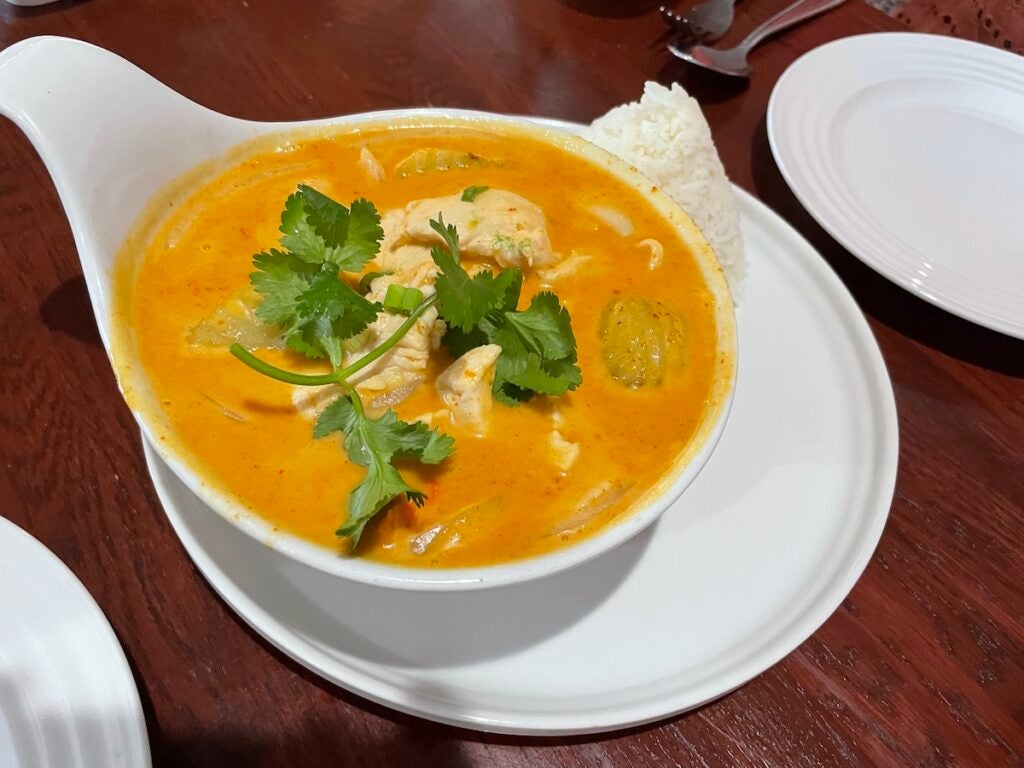 There are eight different curries to choose from, fried rice and noodle dishes (including an noodle soup entrée), fish and seafood, duck and a good list of vegetarian items — plus soups, salads, desserts and a short kids menu — which makes sense since a lot of the main menu seems kid friendly. The restaurant also has a good variety of flavored green teas (from rose to lychee to strawberry), milk teas and slushes.