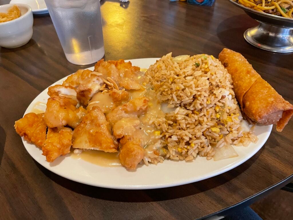 I somewhat guiltily have to admit that the other dish I love is almond chicken. Yes, that sliced fried breast of chicken doused in thick brown gravy, topped with almonds. It was my go-to back in my restaurant days, and when it’s done right, it’s great.