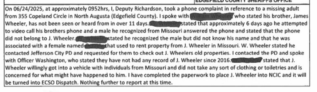 According to the sheriff, Wheeler was accustomed to traveling and, as a retired military man, would sometimes be gone for weeks at a time. That pattern initially delayed concern among relatives.