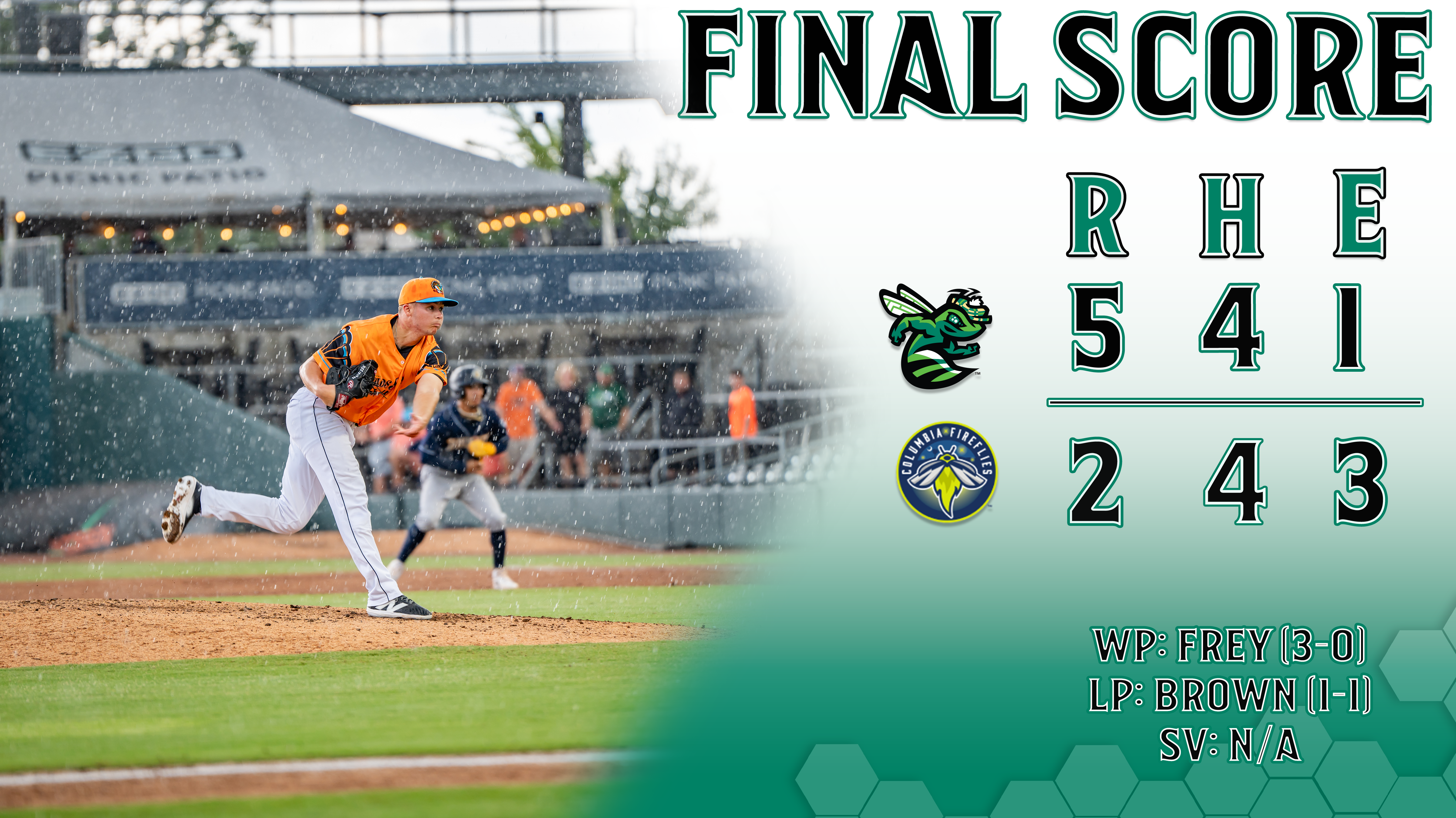 NORTH AUGUSTA, SC: Left-hander Riley Frey worked seven scoreless innings, the longest outing of the year by a GreenJackets pitcher, en route to a 5-2 win at Pelicans Ballpark in Myrtle Beach Tuesday night.