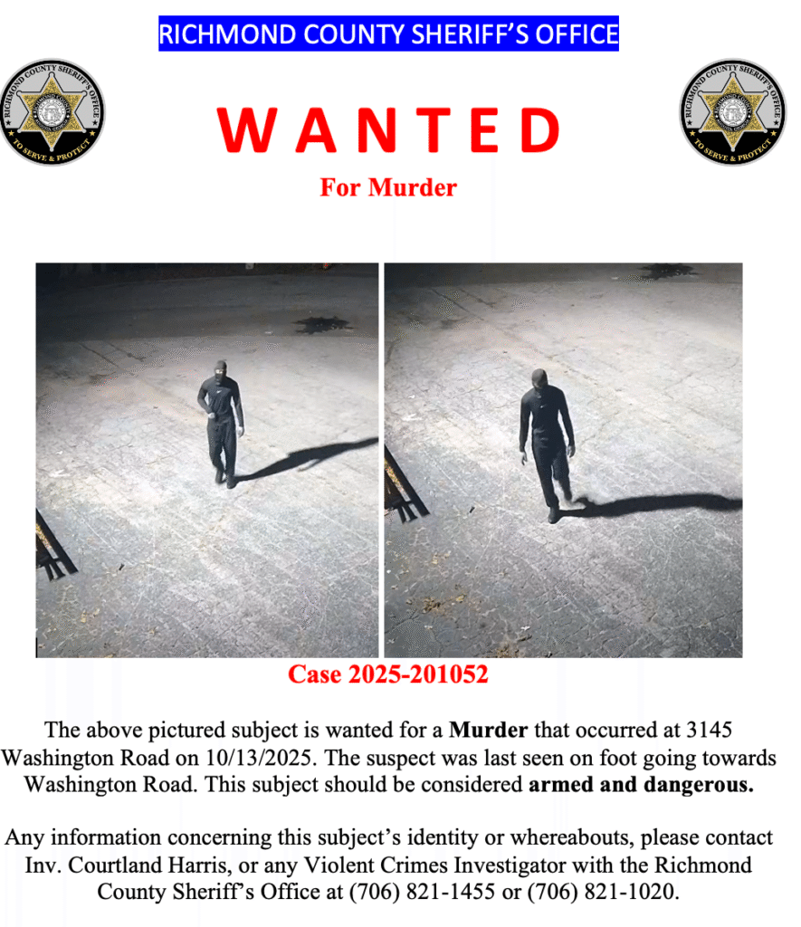 Authorities said the suspect fled on foot toward Washington Road and should be considered armed and dangerous. Anyone with information is asked to contact Investigator Courtland Harris or any Violent Crimes Investigator with the Richmond County Sheriff’s Office at (706) 821-1455 or (706) 821-1020.