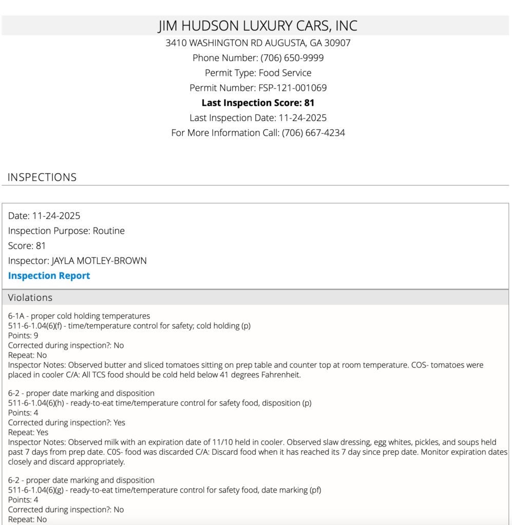 This week’s lowest health inspection score was an 81 earned by Jim Hudson Luxury Cars Inc., located at 3410 Washington Road, in Augusta.