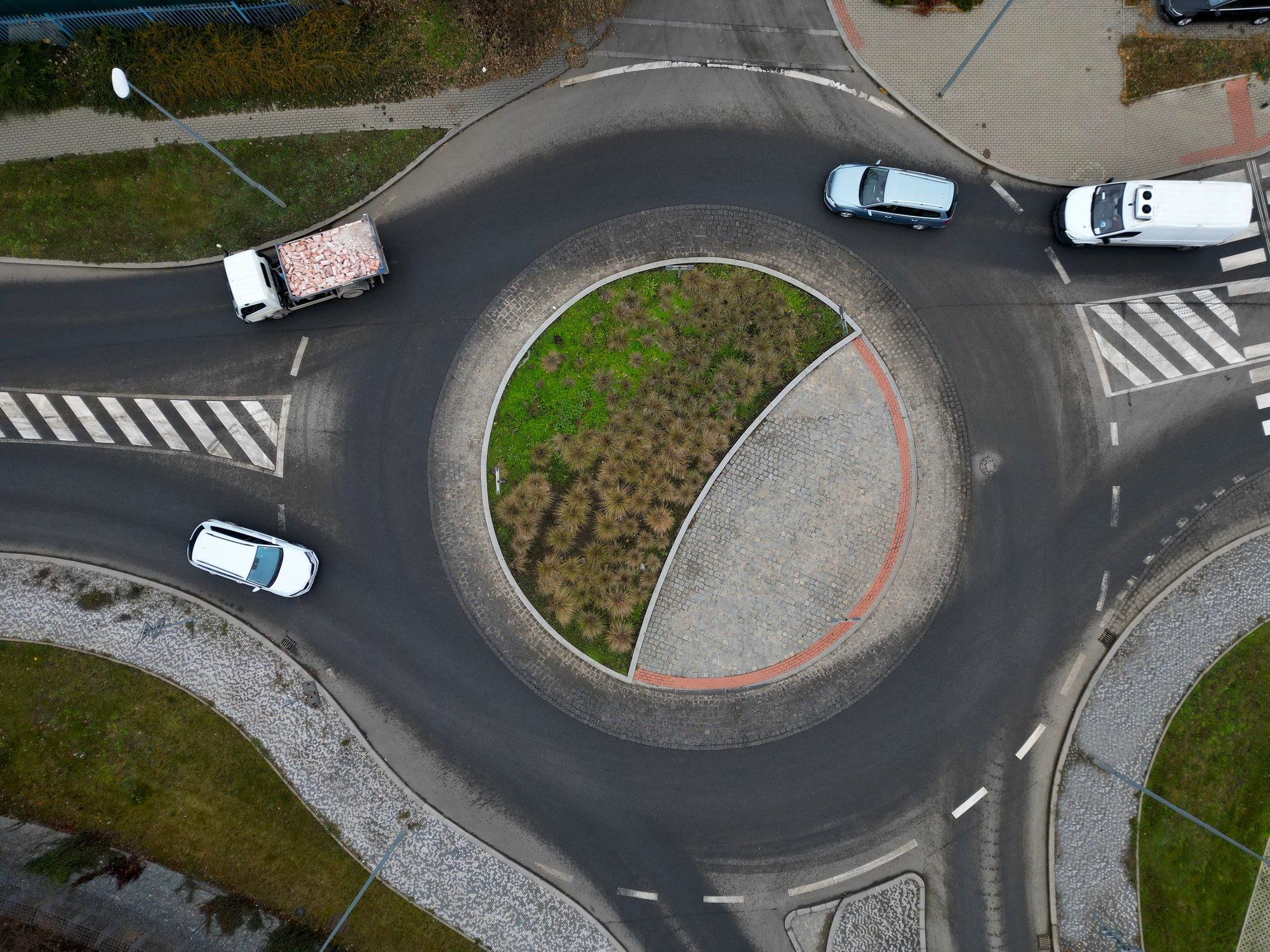 Some roundabouts need to be adapted for long trucks and oversized loads by paving them to reduce the angle of approach.