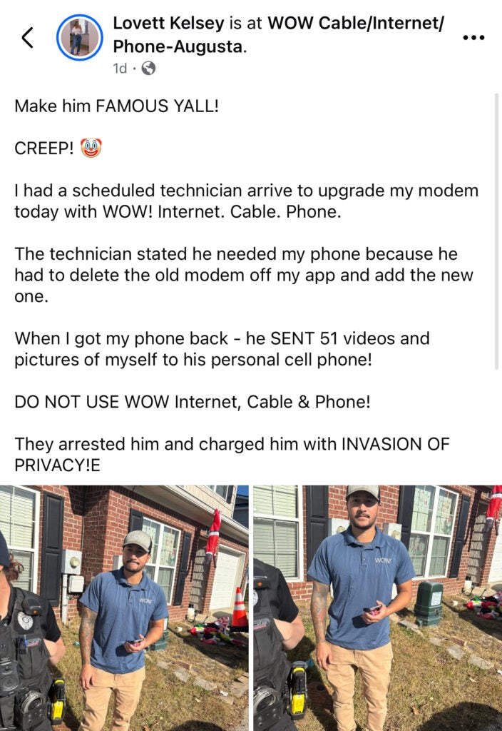 Grovetown police arrested a WOW Internet technician Tuesday following a complaint from a customer during a service visit, according to authorities.