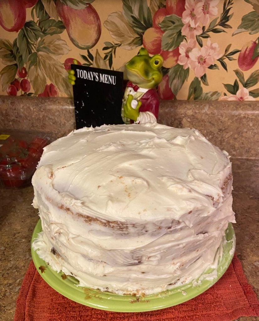 I wouldn’t call myself an expert with cream cheese frosting, but by now, it’s become much easier to make. Four simple ingredients and the hardest part is making sure I don’t add too much confectioners’ sugar to the cream cheese and butter. That causes quite a mess, and when you’re baking a cake in your mom’s kitchen, I don’t recommend it.