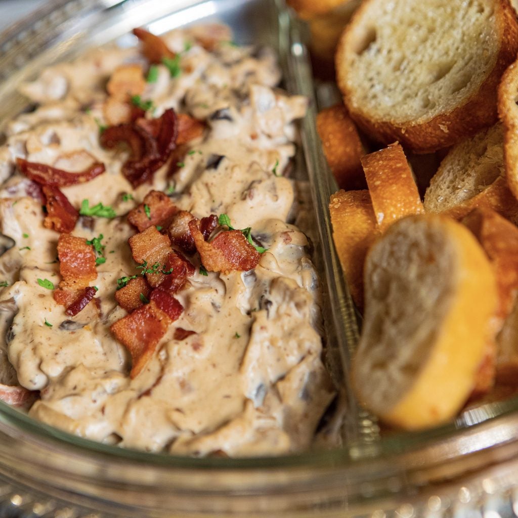 Right off the bat, how about a fan favorite from my almost 40 years in catering: Hot Mushroom Dip. I know there are a lot of locals that recall this dish at wedding receptions and cocktail parties that we catered, and now with the new cookbook, you can make it yourself. It is definitely worth the effort to make – just in time for the National Championship game and Super Bowl.