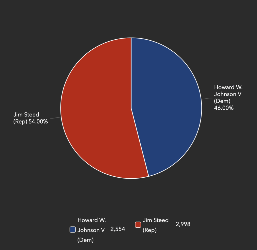The unofficial results had Steed (R) with 2,998 votes (54%) and Howard Johnson (D) with 2,546 (46%) votes.
