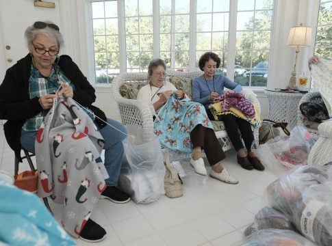 One Saturday a month volunteers gather for blanket making day in community events rooms at Platt’s Funeral Home.
