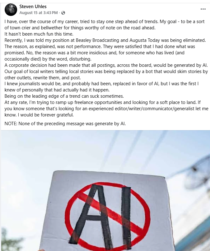 That is easier said than done when the story is about your industry. Long-time Augusta entertainment writer Steven Uhles, who had been the editor-in-chief of Augusta Today, a start-up digital newspaper created by a local broadcast media company, found himself in such a predicament when he said on social media that he had been unceremoniously tossed aside in favor of Artificial Intelligence.