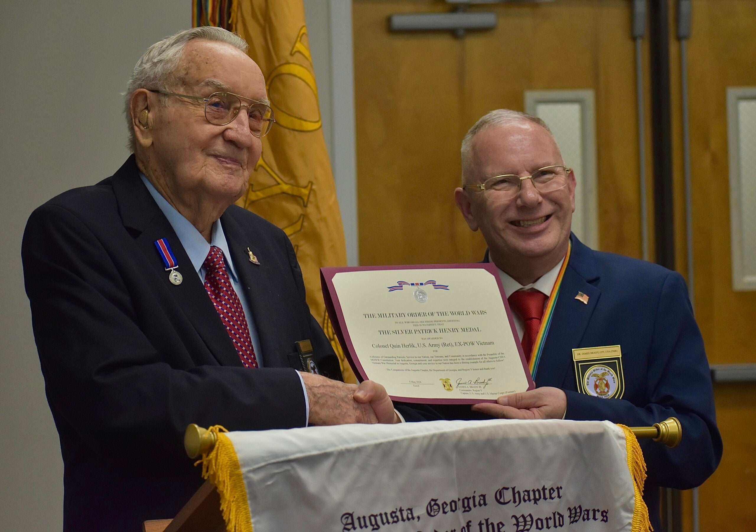 During the meeting, a 91-year-old Augusta resident, retired Col. Quin Herlik, who was a prisoner of war in Vietnam and Cambodia in 1969, was honored by attendees with the Silver Patrick Henry Award.