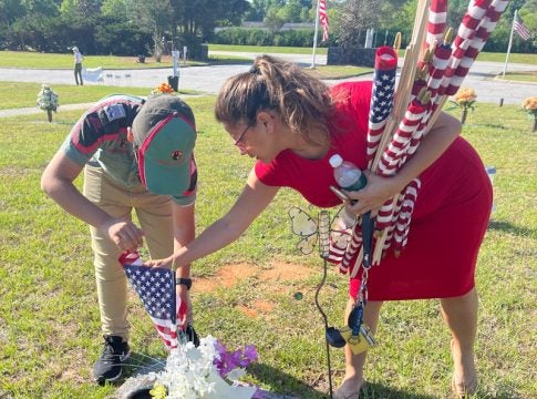 About 30 volunteers started Memorial Day weekend by marking the graves of military veterans with flags at Bellevue Memorial Gardens.
