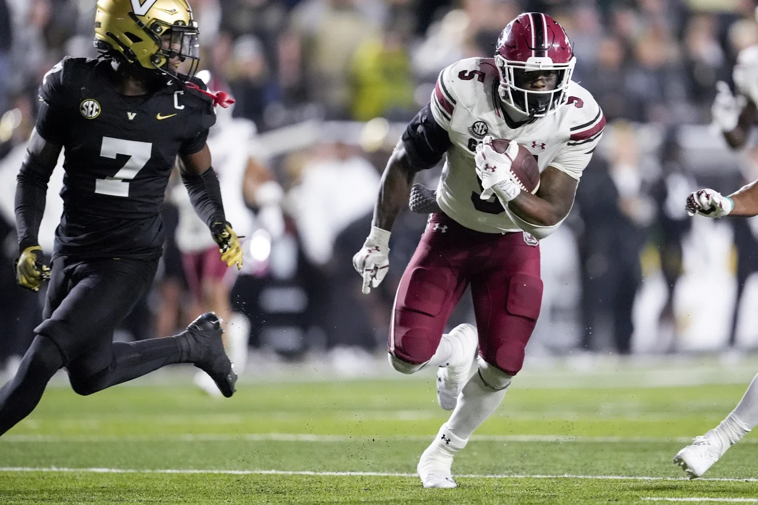Sanders averaged 8.2 yards a rush against the improved Commodores. He had scoring runs of 33 and 1 yard, plus he added a 43-yard TD catch from LaNorris Sellers for a Gamecocks squad almost no one in the SEC wants to face right now.