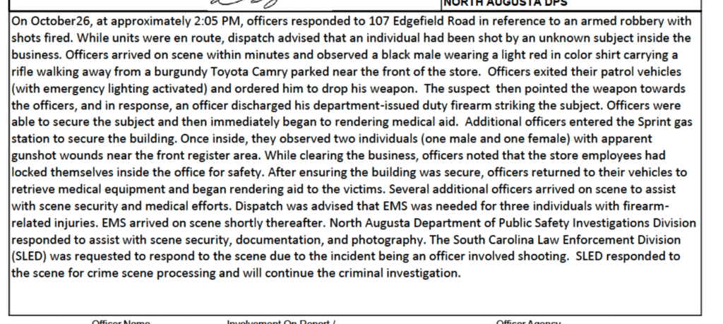 Chief Junior Johnson of North Augusta Public Safety confirmed that the incident has been turned over to the South Carolina Law Enforcement Division (SLED) for investigation, following standard protocol in officer-involved shootings. “Our hearts go out to the families of the victims,” said Chief Johnson. “We ask for the community’s patience as SLED conducts a thorough investigation into this tragic event.”