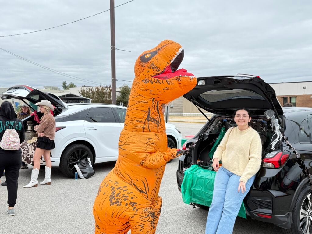 A student in an inflatable dinosaur costume greets visitors during Evans High’s Trunk-or-Treat celebration. Photo by Drew Wall.