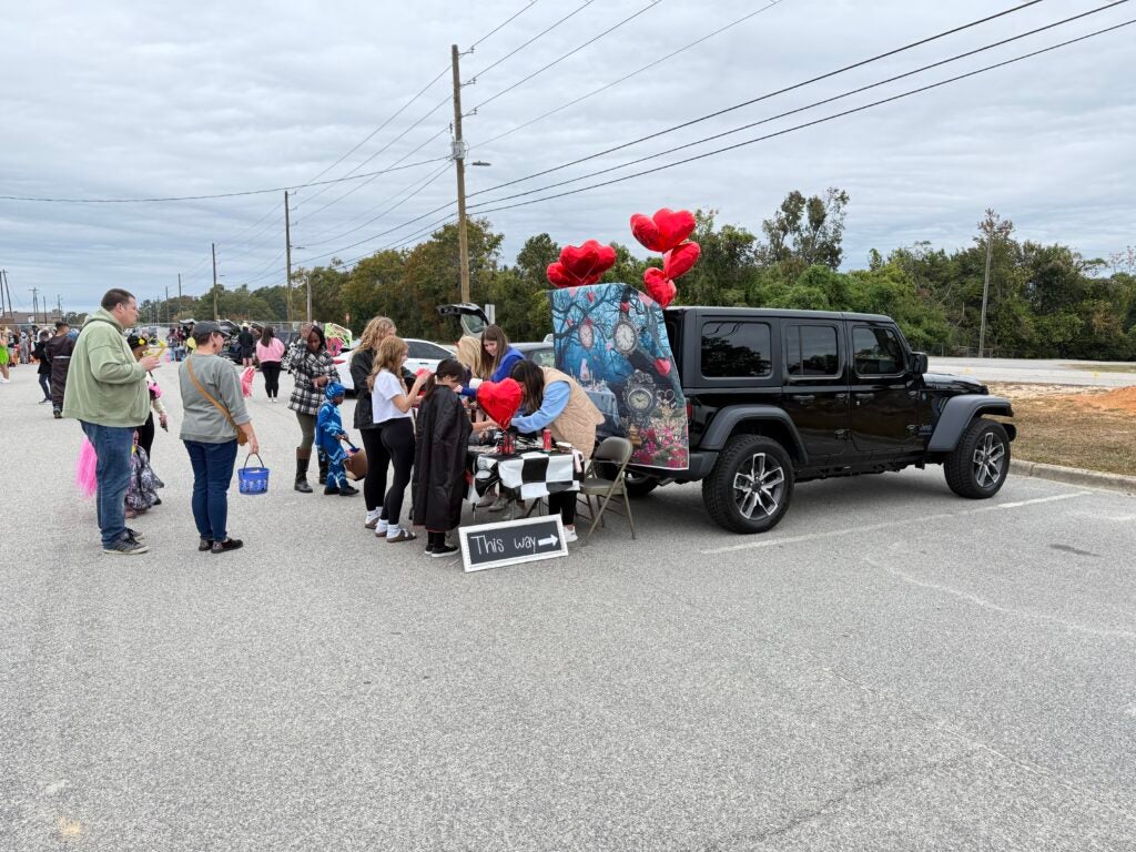 Families and children line up at a hearts themed trunk to collect candy during Evans High School’s Beta Club Trunk-or-Treat. Photo by Drew Wall.