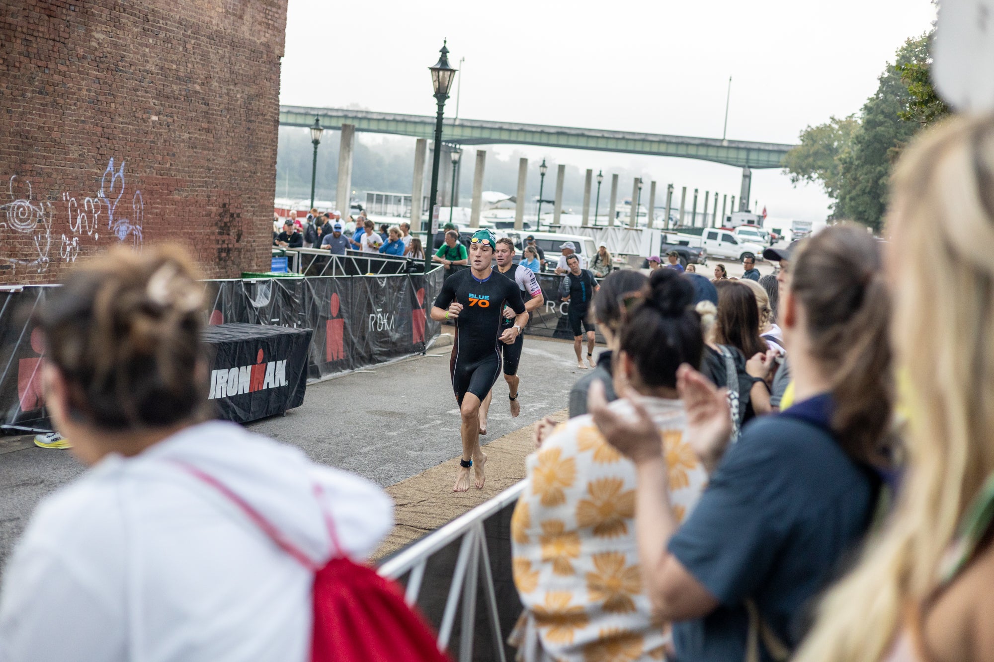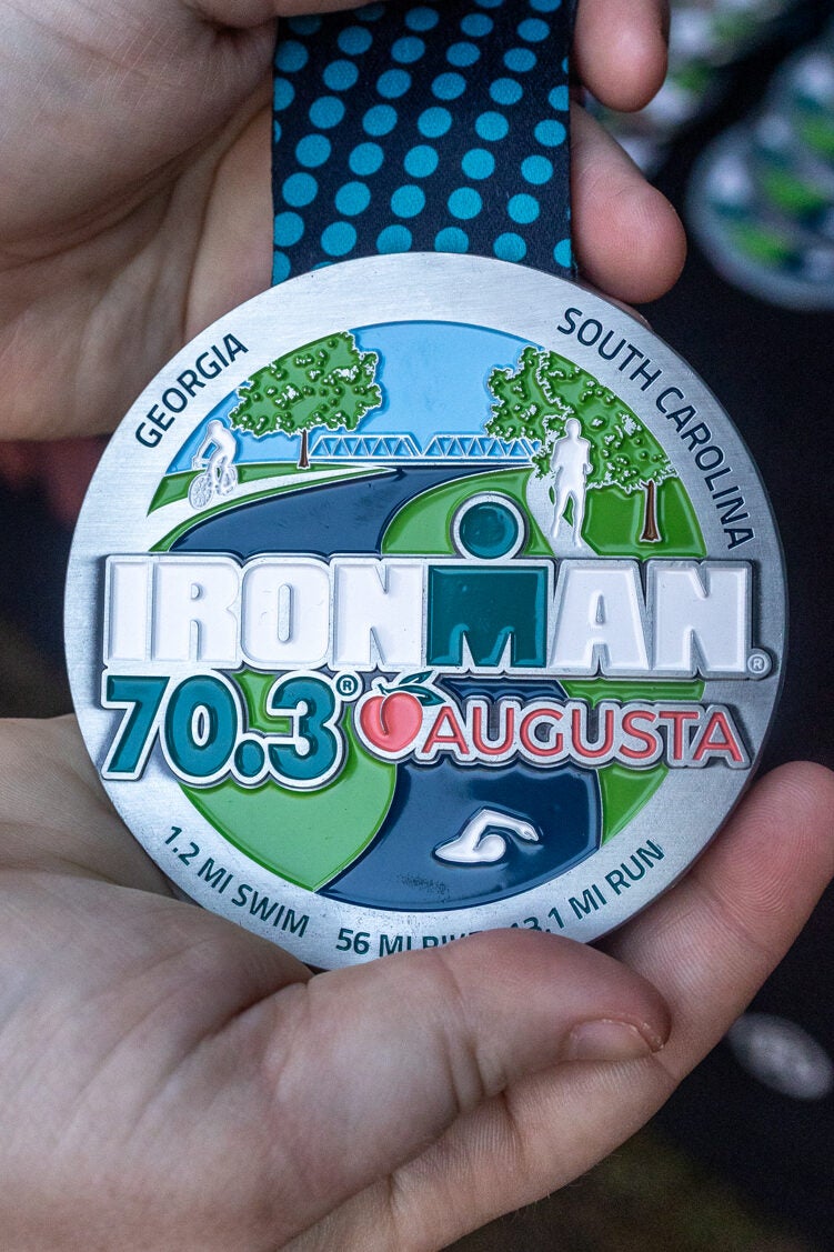 Ironman competitor exiting the swimming portion, running to start the cycling portion. Photo by Randy PaceSpectators gather at the Fifth Street Freedom Pedestrian Bridge for The 2025 Ironman 70.3 Augusta. Photo by Randy Pace2025 Ironman 70.3 Augusta competitors swimming in the Savannah River for the short 1.2 mile swim. Photo by Randy PaceIronman competitor transitioning from the swimming portion to the cycling part of the race. Photo by Randy PaceIronman competitors speed through downtown Augusta during The 2025 Ironman 70.3 AugustaKatherine Reagin and children cheering for competitor Kevin Reagin to pass through the swimming portion. Photo by Randy PaceCyclist reflecting in a puddle during the 56 mile bike ride throughout the CSRA. Photo by Randy PaceIronman competitors running through a tunnel at Brick pond park in North Augusta, S.C. for the final leg of the race. Photo by Randy Pace2025 Ironman 70.3 Augusta medals of achievement for each daring finisher of the race. Photo by Randy Pace
