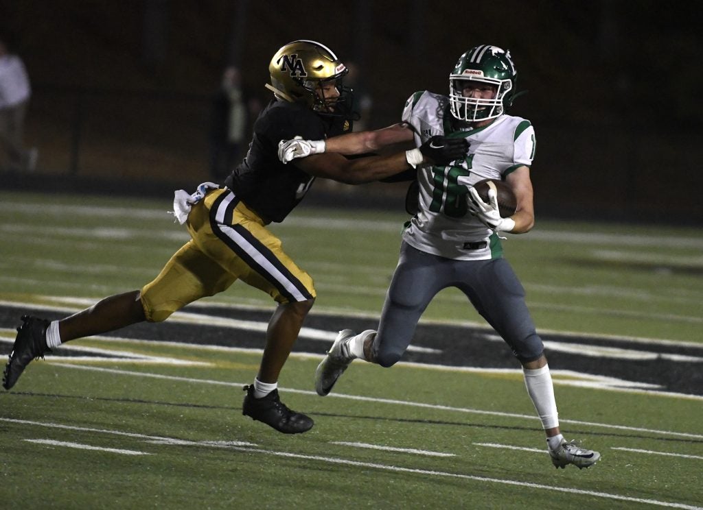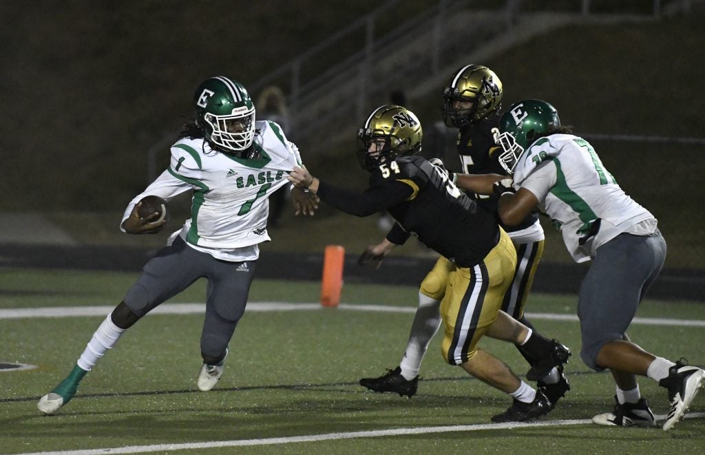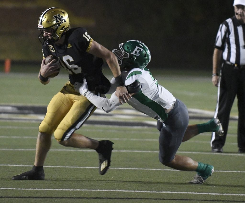 Luke Peeples of Easley, right, tries to tackle North Augusta QB Colson Brown on Friday, Nov. 4, 2022 in North Augusta, SC. North Augusta defeated Easley 26-14 to advance to the 2nd round of the State High School football playoffs. Mike Adams photo.Christian Jackson of North Augusta, left, tracks down Easley’s Ethan Alexander on Friday, Nov. 4, 2022 in North Augusta, SC. North Augusta defeated Easley 26-14 to advance to the 2nd round of the State High School football playoffs. Mike Adams photo.Andrew Pennica, left, of Easley tries to hold to DJ Curry of North Augusta as Curry powers ahead for positive yards on Friday, Nov. 4, 2022 in North Augusta, SC. North Augusta defeated Easley 26-14 to advance to the 2nd round of the State High School football playoffs. Mike Adams photo.Easley QB Kalab Sutton, left, is grabbed by North Augusta’s Mills Stone on Friday, Nov. 4, 2022 in North Augusta, SC. North Augusta defeated Easley 26-14 to advance to the 2nd round of the State High School football playoffs. Mike Adams photo.
