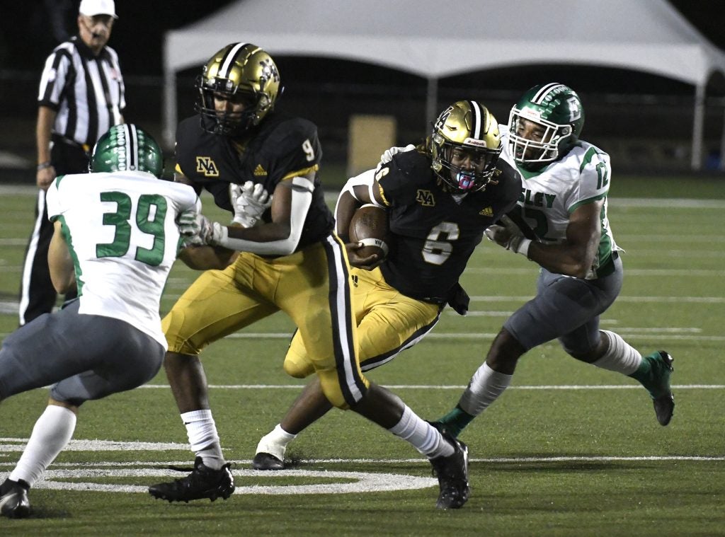 Amarri Welcher of North Augusta rushes up field through Easley defenders on Friday, Nov. 4, 2022 in North Augusta, SC. North Augusta defeated Easley 26-14 to advance to the 2nd round of the State High School football playoffs. Mike Adams photo.