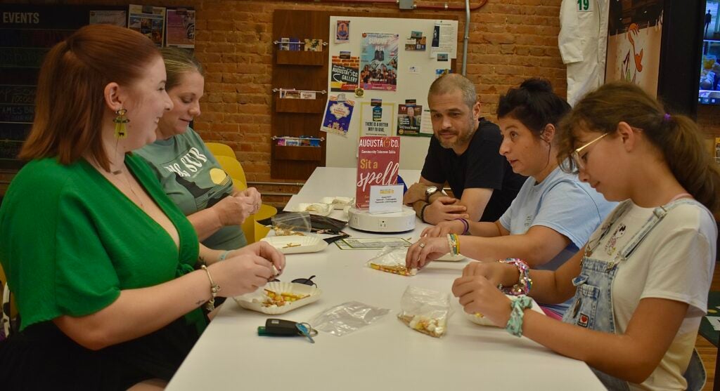 Camp Soul City’s headquarters were held at Augusta & Co. and handed out maps and merchandise to campers to get their downtown trek started. Staff photo by Liz Wright.Camp Soul City’s headquarters were held at Augusta & Co. and handed out maps and merchandise to campers to get their downtown trek started. Staff photo by Liz Wright.At Augusta & Co., campers built an edible campfire to start their Saturday, self-guided tour. Staff photo by Liz Wright.A camper scolds another for eating pieces of her campfire, prior to successfully constructing her creation. Staff photo by Liz Wright.Brandy Gibson, owner of Tiffanie Bleu Bridal, places a temporary tattoo on an enthusiastic camper. Staff photo by Liz Wright.Campers of all ages were excited to receive temporary tattoos during the third annual Camp Soul City. Staff photo by Liz Wright.Brandy Gibson, owner of Tiffanie Bleu Bridal, places a temporary tattoo on an enthusiastic camper. Staff photo by Liz Wright.Each business featured a bowl of themed pins, or merit badges, for campers to take home after completing a fun activity. Staff photo by Liz Wright.At The Book Tavern, participants creatively collaged bookmarks using recycled newspapers, magazines and books. First time camper and mom Kelly Galvarino (center, in black and white stripped shirt), who traveled from Aiken, said she was thrilled to visit Downtown Augusta and explore the area’s “eclectic shops.” Staff photo by Liz Wright.Grantski Records’ employees also joined in on the day’s festivities by creating and sporting themed tie-dye T-shirts. Staff photo by Liz Wright.Field Botanicals, known for selling naturally sourced products, enticed campers to make all-natural bug spray to stay safe outdoors during the summertime. Staff photo by Liz Wright.Camp Soul City participants were instructed to mix several ingredients together to create an all-natural bug spray. Staff photo by Liz Wright.America Barrava (right) helps her nephew at different stations while earning different merit badges from multiple participating businesses. Staff photo by Liz Wright.