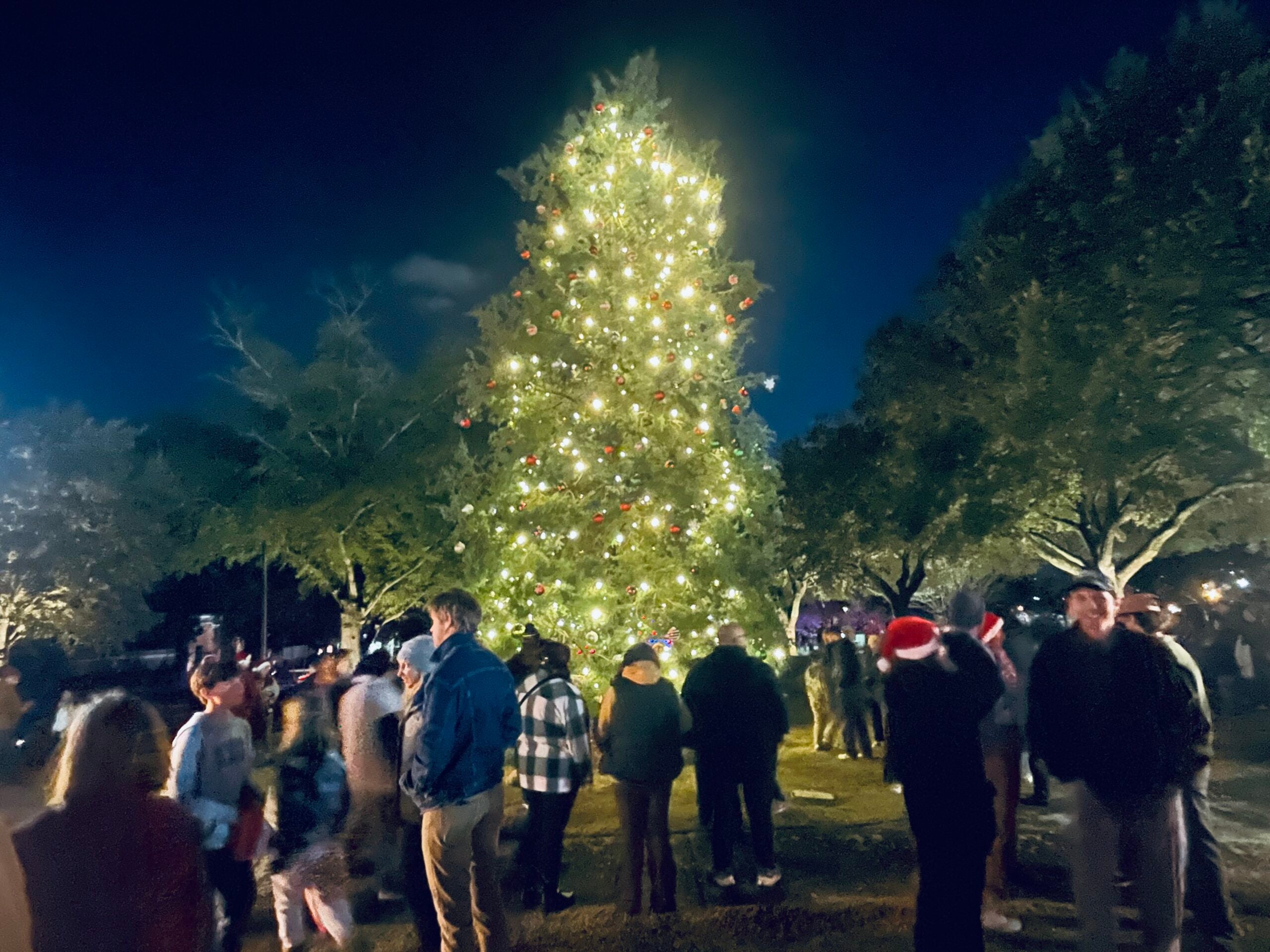 A crowd gathers around the newly-lit Christmas tree in North Augusta's Calhoun Park. Photo by Skyler Andrews.
