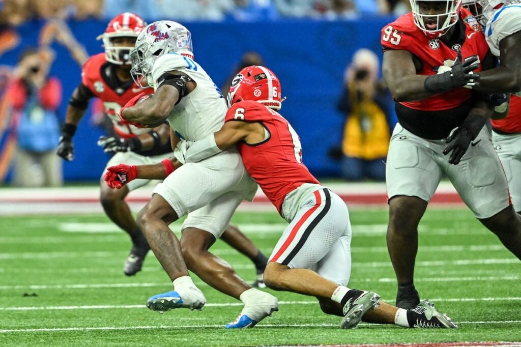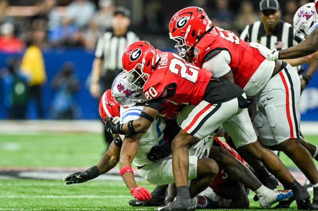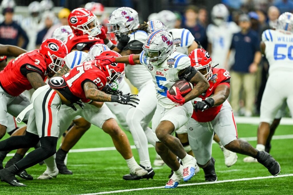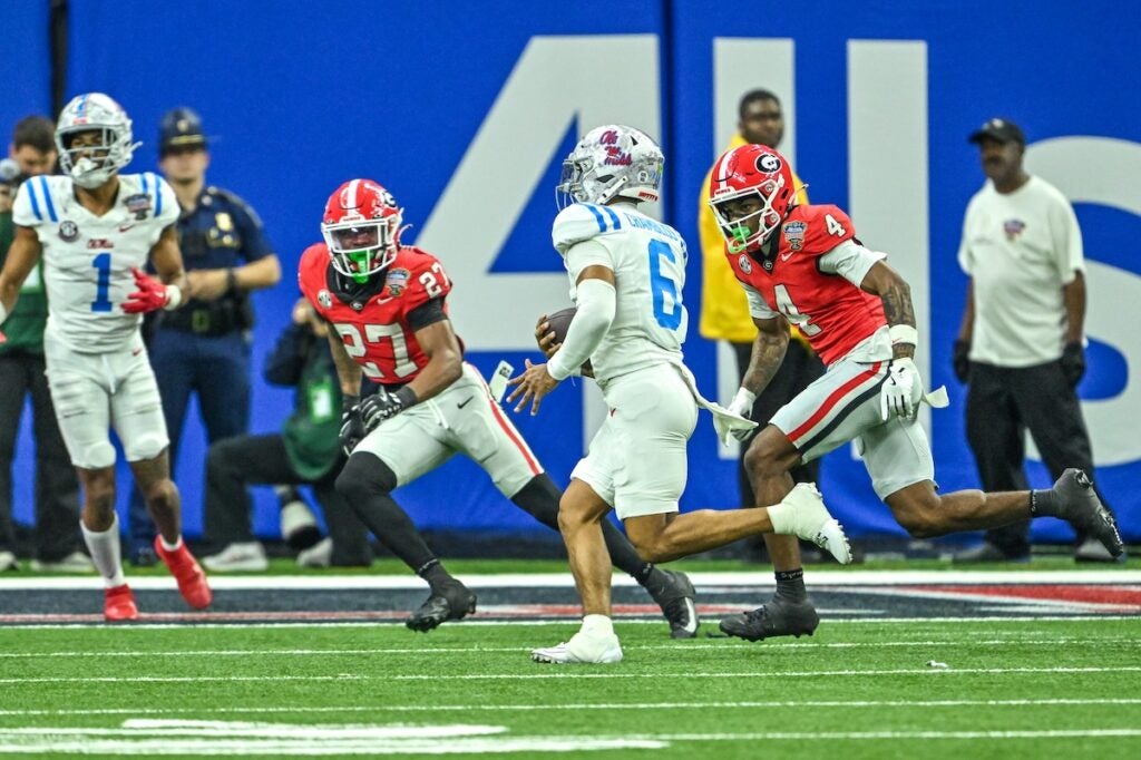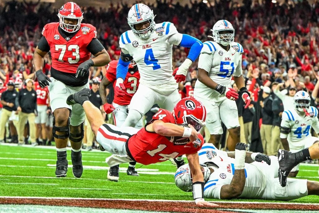 Georgia quarterback Gunner Stockton (14) dives for a touchdown during the Allstate Sugar Bowl College Football Quarterfinal game against Ole Miss at the Caesars Superdome in New Orleans, LA, on Thursday, Jan. 1, 2026. (photo by Rob Davis)Georgia Redcoat Band is silhouetted by fireworks when the Bulldogs run on the field before the Allstate Sugar Bowl College Football Quarterfinal game College Football Quarterfinal against Ole Miss at the Caesars Superdome in New Orleans, LA, on Thursday, Jan. 1, 2026. (photo by Rob Davis)Georgia defensive back Jacorey Thomas (20) leads defenders in tackline Ole Miss player during the Allstate Sugar Bowl College Football Quarterfinal game against Ole Miss at the Caesars Superdome in New Orleans, LA, on Thursday, Jan. 1, 2026. (photo by Rob Davis)Georgia players chase Ole Miss running back Kewan Lacey (5) during the Allstate Sugar Bowl College Football Quarterfinal game against Ole Miss at the Caesars Superdome in New Orleans, LA, on Thursday, Jan. 1, 2026. (photo by Rob Davis)Georgia defensive back Daylen Everette (6) tackles Ole Miss player during the Allstate Sugar Bowl College Football Quarterfinal game against Ole Miss at the Caesars Superdome in New Orleans, LA, on Thursday, Jan. 1, 2026. (photo by Rob Davis)Ole Miss head coach Pete Golding watches the action during the Allstate Sugar Bowl College Football Quarterfinal game against Georgia at the Caesars Superdome in New Orleans, LA, on Thursday, Jan. 1, 2026. (photo by Rob Davis)Georgia defenders chase Ole Miss quarterback Trinidad Chambliss (6) during the Allstate Sugar Bowl College Football Quarterfinal game against Ole Miss at the Caesars Superdome in New Orleans, LA, on Thursday, Jan. 1, 2026. (photo by Rob Davis)Ole Miss quarterback Trinidad Chambliss (6) throws a pass during the Allstate Sugar Bowl College Football Quarterfinal game against Georgia at the Caesars Superdome in New Orleans, LA, on Thursday, Jan. 1, 2026. (photo by Rob Davis)Georgia defensive lineman Christen Miller (52) tackles Ole Miss running back Kewan Lacy (5) after losing his helmet during the Allstate Sugar Bowl College Football Quarterfinal game against Ole Miss at the Caesars Superdome in New Orleans, LA, on Thursday, Jan. 1, 2026. (photo by Rob Davis)Georgia defensive tackle Josh Horton (81) chases Ole Miss quarterback Trinidad Chambliss (6) during the Allstate Sugar Bowl College Football Quarterfinal game against Ole Miss at the Caesars Superdome in New Orleans, LA, on Thursday, Jan. 1, 2026. (photo by Rob Davis)Georgia head coach Kirby Smart pleads with official about a missed holding penalty during the Allstate Sugar Bowl College Football Quarterfinal game against Ole Miss at the Caesars Superdome in New Orleans, LA, on Thursday, Jan. 1, 2026. (photo by Rob Davis)