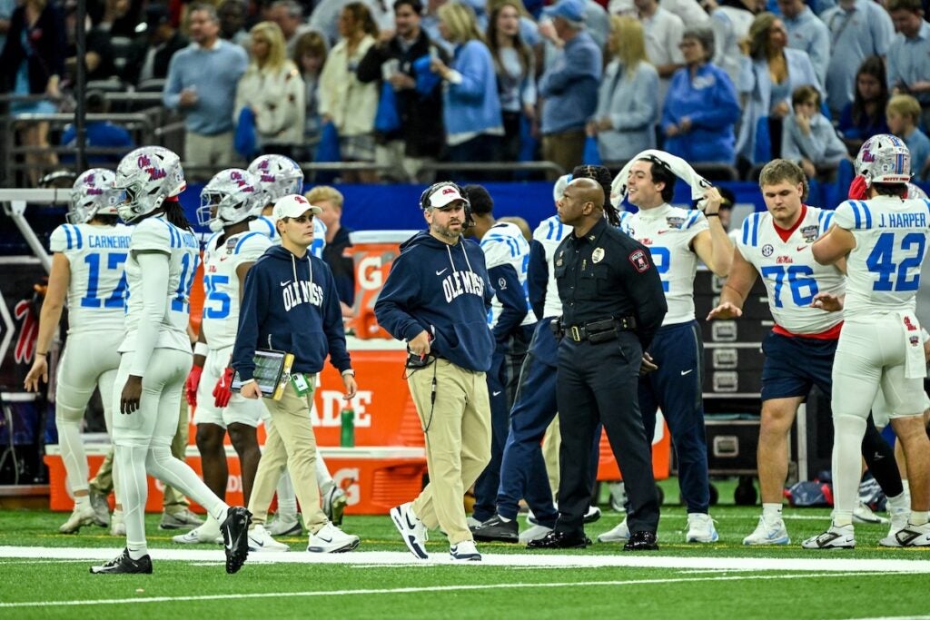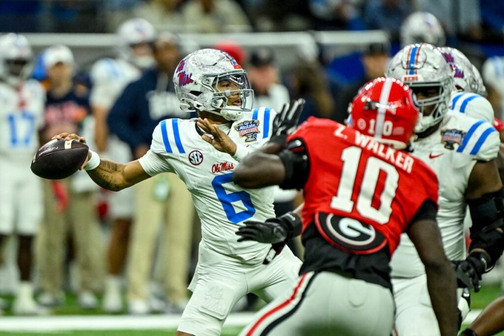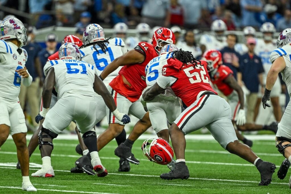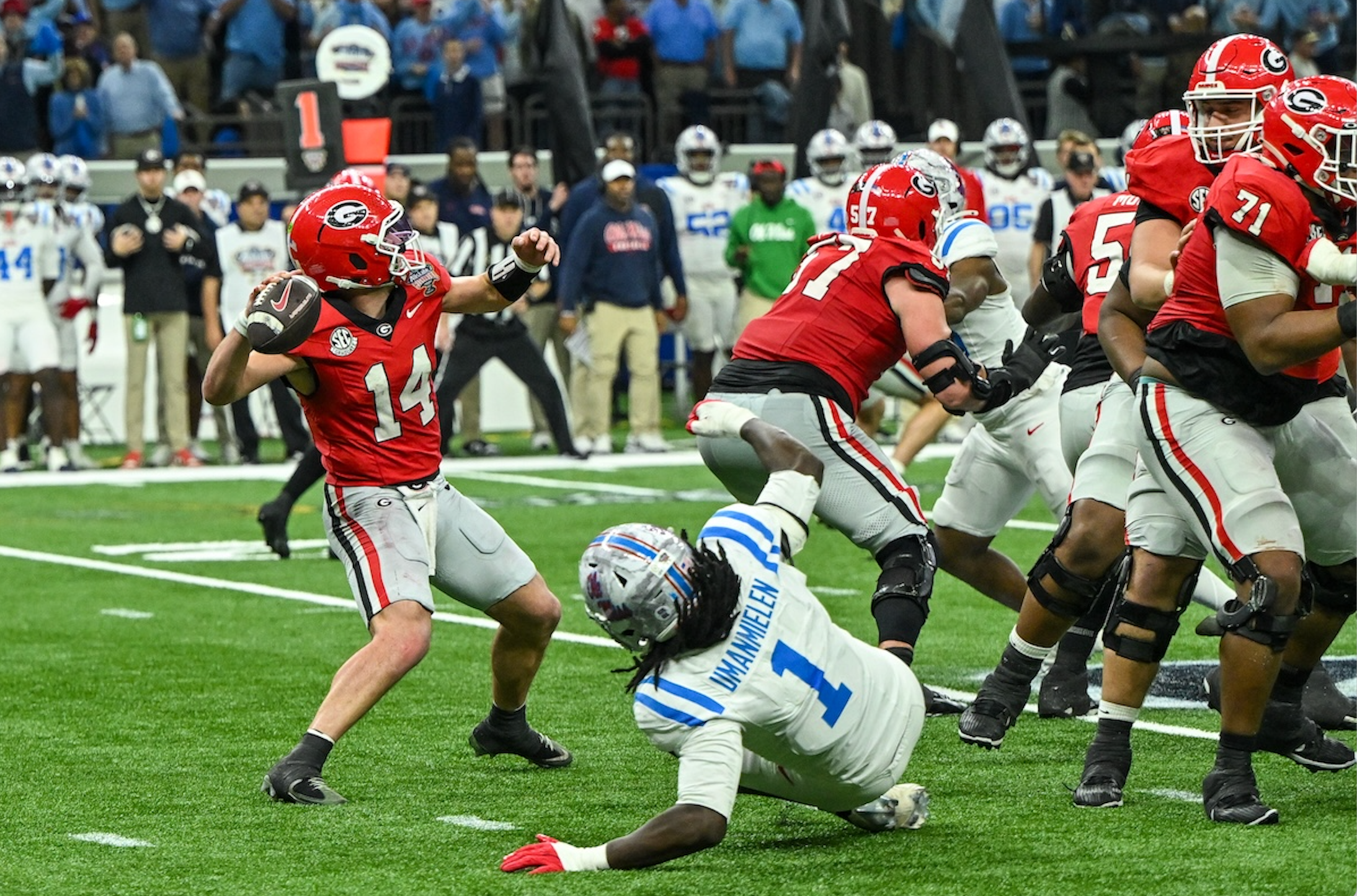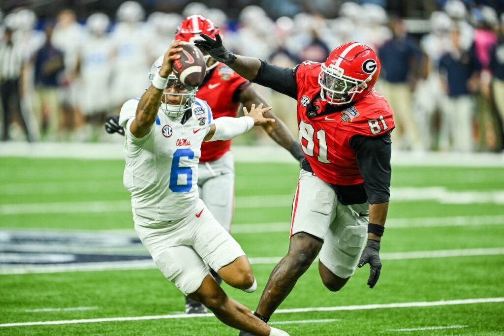 Georgia quarterback Gunner Stockton (14) dives for a touchdown during the Allstate Sugar Bowl College Football Quarterfinal game against Ole Miss at the Caesars Superdome in New Orleans, LA, on Thursday, Jan. 1, 2026. (photo by Rob Davis)Georgia Redcoat Band is silhouetted by fireworks when the Bulldogs run on the field before the Allstate Sugar Bowl College Football Quarterfinal game College Football Quarterfinal against Ole Miss at the Caesars Superdome in New Orleans, LA, on Thursday, Jan. 1, 2026. (photo by Rob Davis)Georgia defensive back Jacorey Thomas (20) leads defenders in tackline Ole Miss player during the Allstate Sugar Bowl College Football Quarterfinal game against Ole Miss at the Caesars Superdome in New Orleans, LA, on Thursday, Jan. 1, 2026. (photo by Rob Davis)Georgia players chase Ole Miss running back Kewan Lacey (5) during the Allstate Sugar Bowl College Football Quarterfinal game against Ole Miss at the Caesars Superdome in New Orleans, LA, on Thursday, Jan. 1, 2026. (photo by Rob Davis)Georgia defensive back Daylen Everette (6) tackles Ole Miss player during the Allstate Sugar Bowl College Football Quarterfinal game against Ole Miss at the Caesars Superdome in New Orleans, LA, on Thursday, Jan. 1, 2026. (photo by Rob Davis)Ole Miss head coach Pete Golding watches the action during the Allstate Sugar Bowl College Football Quarterfinal game against Georgia at the Caesars Superdome in New Orleans, LA, on Thursday, Jan. 1, 2026. (photo by Rob Davis)Georgia defenders chase Ole Miss quarterback Trinidad Chambliss (6) during the Allstate Sugar Bowl College Football Quarterfinal game against Ole Miss at the Caesars Superdome in New Orleans, LA, on Thursday, Jan. 1, 2026. (photo by Rob Davis)Ole Miss quarterback Trinidad Chambliss (6) throws a pass during the Allstate Sugar Bowl College Football Quarterfinal game against Georgia at the Caesars Superdome in New Orleans, LA, on Thursday, Jan. 1, 2026. (photo by Rob Davis)Georgia defensive lineman Christen Miller (52) tackles Ole Miss running back Kewan Lacy (5) after losing his helmet during the Allstate Sugar Bowl College Football Quarterfinal game against Ole Miss at the Caesars Superdome in New Orleans, LA, on Thursday, Jan. 1, 2026. (photo by Rob Davis)Georgia defensive tackle Josh Horton (81) chases Ole Miss quarterback Trinidad Chambliss (6) during the Allstate Sugar Bowl College Football Quarterfinal game against Ole Miss at the Caesars Superdome in New Orleans, LA, on Thursday, Jan. 1, 2026. (photo by Rob Davis)Georgia head coach Kirby Smart pleads with official about a missed holding penalty during the Allstate Sugar Bowl College Football Quarterfinal game against Ole Miss at the Caesars Superdome in New Orleans, LA, on Thursday, Jan. 1, 2026. (photo by Rob Davis)