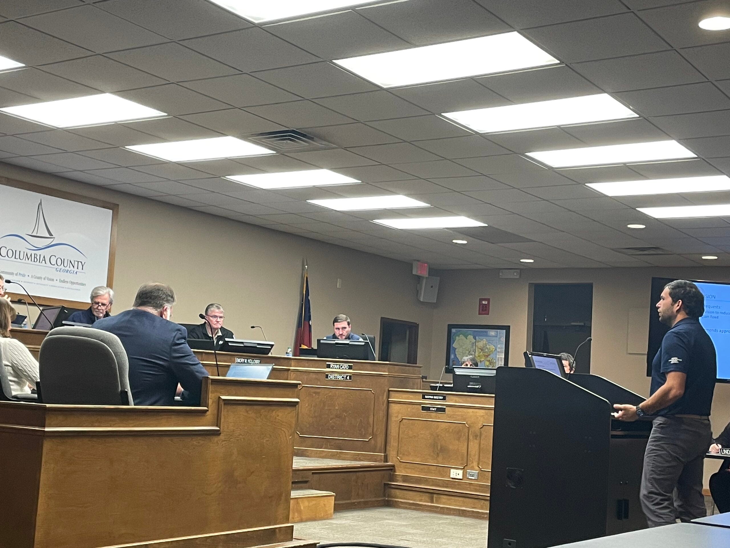 Jon Welsch speaks on behalf of engineering firm Forsite in favor of a PUD revision request at Riverwood for Chick-Fil-A. Photo by Skyler Andrews.